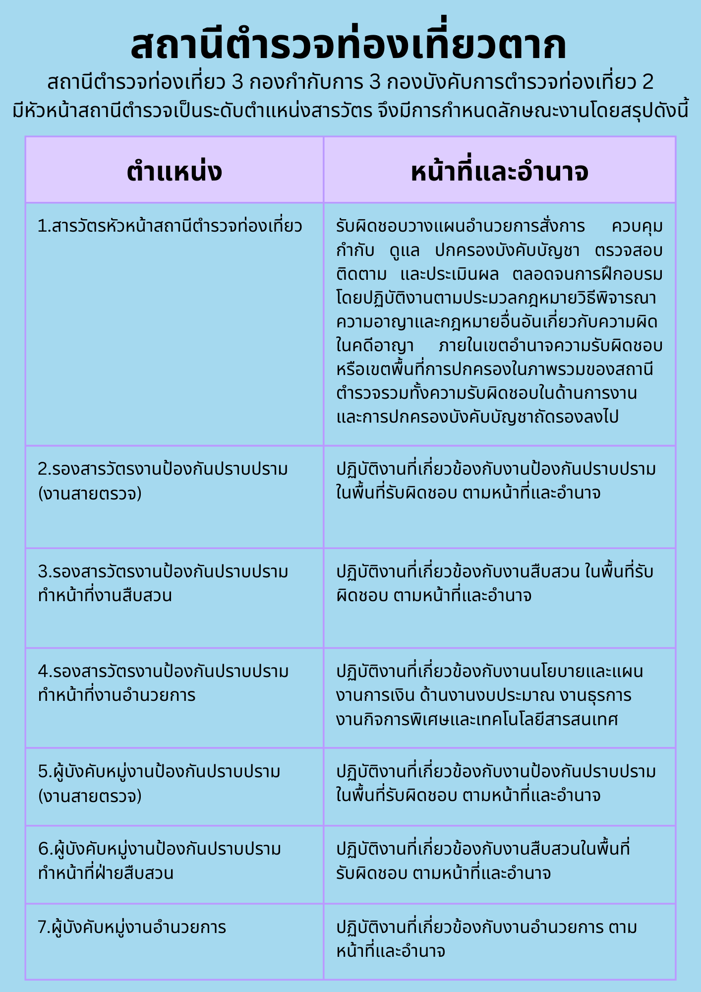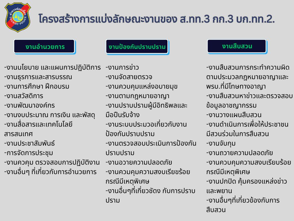 2. ปฏิบัติงานตามประมวลกฏหมายวิธีพิจารณาความอาญา และกฏหมายอื่นเกี่ยวกับความผิดอาญาในเขตอำนาจรับผิดชอบหรือเขตพื้นที่การปกครอง ทั้งในกรณีผู้เสียหายหรือผู้ต้องหาเป็นคนต่างด้าวซึ่งเข้ามาในราชอาณาจักรเป็นการชั่วคราวเพื่อการท่องเที่ยวหรือเพื่อการอื่นตามกฏหมายว่าด้วยคนเข้าเมือง หรือในการณีที่มีผลกระทบต่ออุตสาหกรรมการท่องเที่ยวและความผิดอื่นๆที่เกี่ยวข้อง