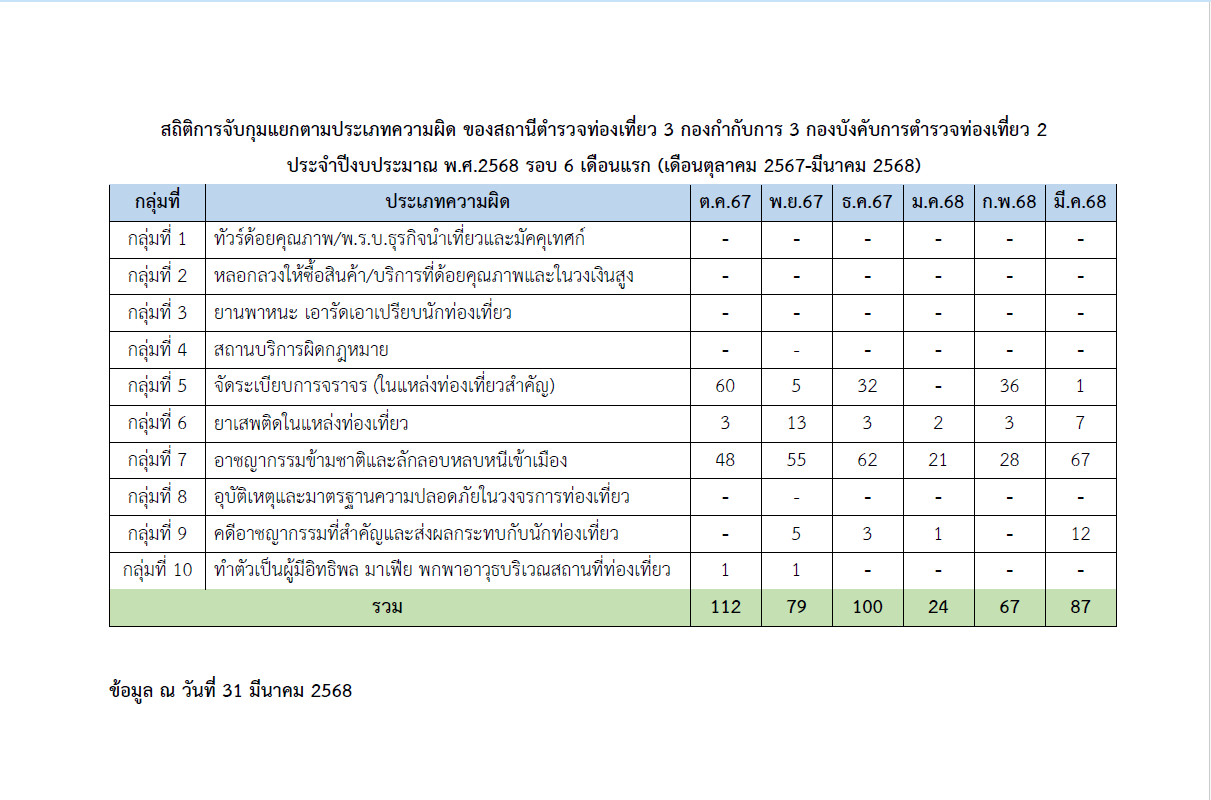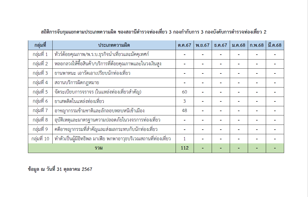 เขียนวันที่ 31 ตุลาคม 256726 เมษายน 2025สถิติการจับกุมแยกตามประเภทความผิด เดือน ต.ค.67 Click here Click here Click here