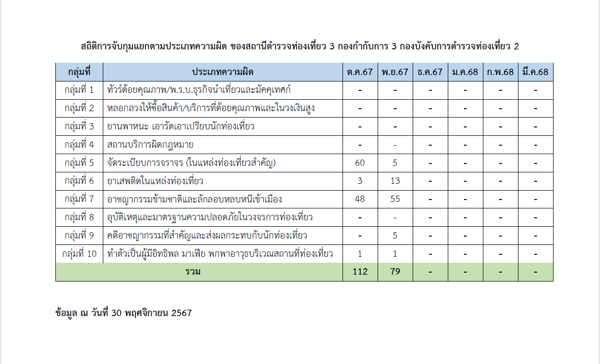เขียนวันที่ 30 พฤศจิกายน 256726 เมษายน 2025สถิติการจับกุมแยกตามประเภทความผิด เดือน พ.ย.67 Click here Click here Click here