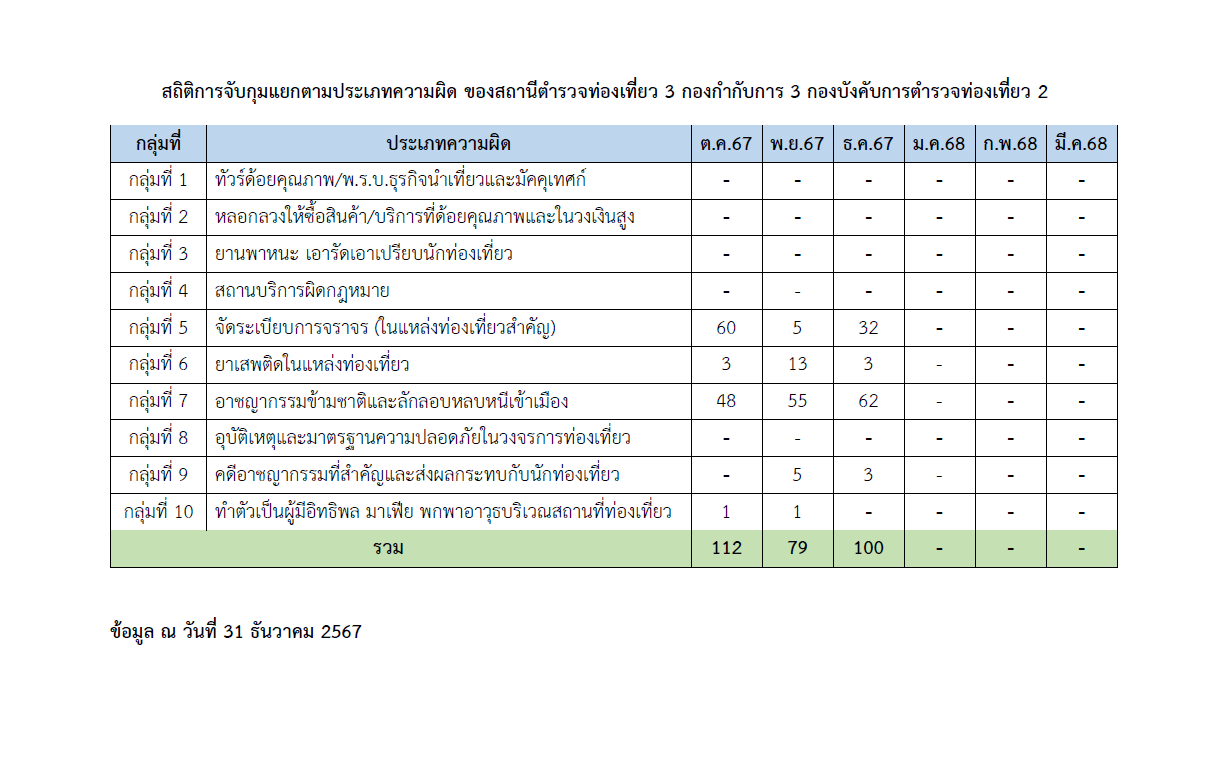 เขียนวันที่ 31 ธันวาคม 256726 เมษายน 2025สถิติการจับกุมแยกตามประเภทความผิด เดือน ธ.ค.67 Click here Click here Click here