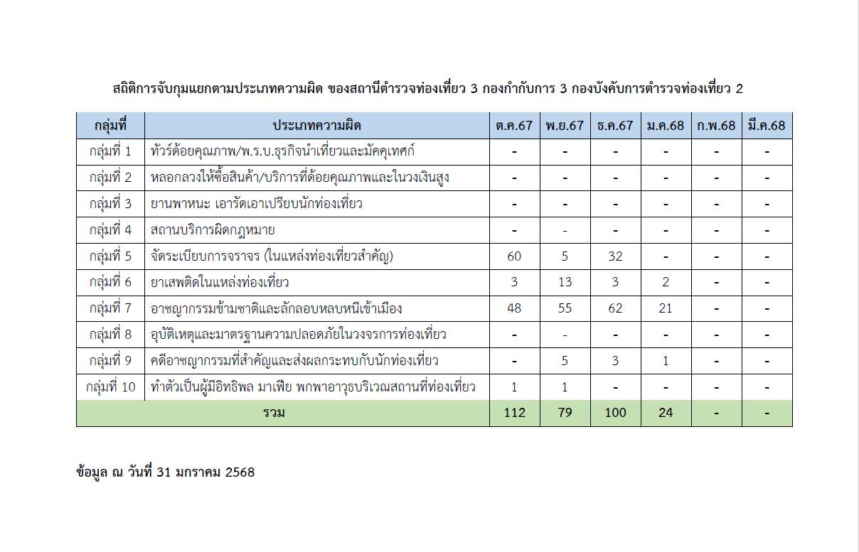 เขียนวันที่ 31 มกราคม 256826 เมษายน 2025สถิติการจับกุมแยกตามประเภทความผิด เดือน ม.ค.68 Click here Click here Click here