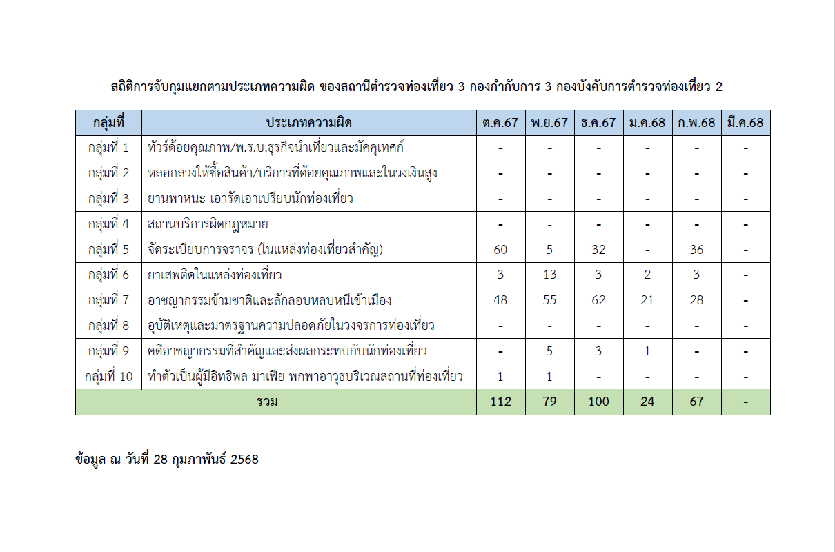 เขียนวันที่ 28 กุมภาพันธ์ 256826 เมษายน 2025สถิติการจับกุมแยกตามประเภทความผิด เดือน ก.พ.68 Click here Click here Click here